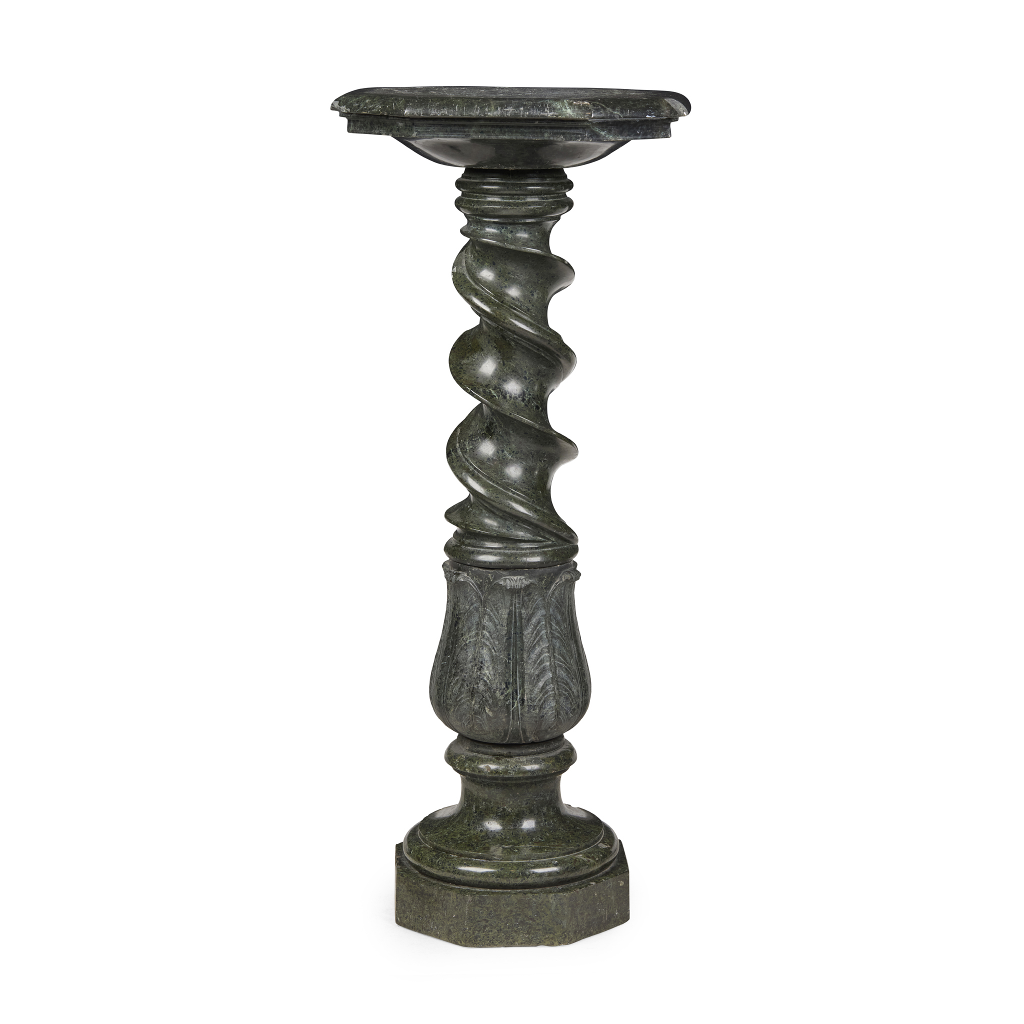the octagonal top on a spiral column supported by a carved lotus flower, on a circular socle with an octagonal plinth base