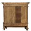 the projecting cavetto moulded cornice with a centre carved beast mask above a plain frieze, the two moulded panel doors with floral appliques to the centre divided by a Corinthian column and flanked by matching columns to the canted angles, opening to a shelved interior, on a moulded shaped base with a long frieze drawer with heavy cast brass swing handles, raised on large bun feet