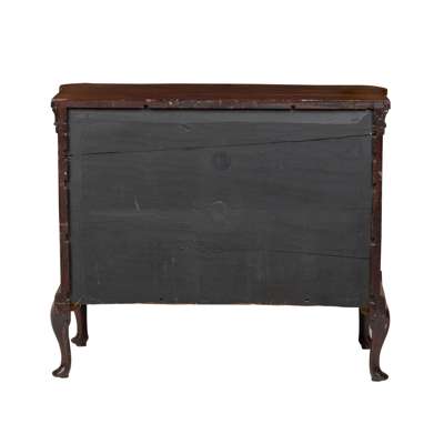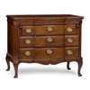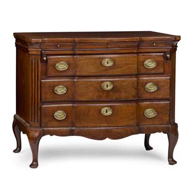 of serpentine outline, the top with outset forecorners above three shallow frieze drawers above a brushing slide, over three long breakfront serpentine drawers, the top drawer with a fall front, flanked by fluted angles and raised on cabriole legs ending in pad feet