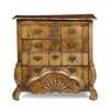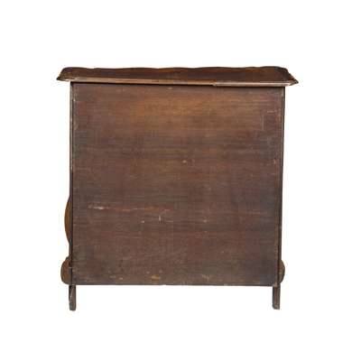the quarter-veneered top with a shaped moulded edge above a slide and four long serpentine drawers, the bottom drawer with a moulded arched panel and palmette, raised on scrolled bracket feet