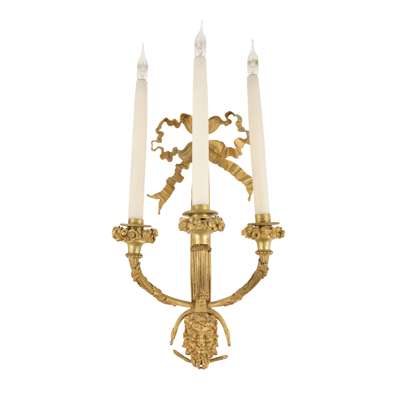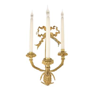 PAIR OF LOUIS XVI STYLE ORMOLU THREE LIGHT WALL LIGHTS