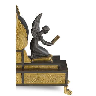 the silvered dial with Roman numbers, the case surmounted by a fern and rosette cast drumhead, flanked by a pair of kneeing muses holding open books placed on cushions, the stepped plinth set with cast friezes of fruiting vines centred by a lion mask above and a horse mask flanked by cornucopia below, raised on cast paw feet, the twin train movement with silk suspension and outside count wheel, the backplate stamped ‘J B Dorval Paris’ and numbered 'L 527'