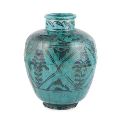of ovoid form with a cylindrical neck rim, the turquoise glazed body with black enamelled stylised foliate decoration within diamond shaped panels, the shoulder with further foliate designs, unmarked