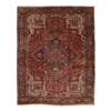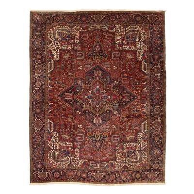 the rust red field with indigo and red lozenge medallion, ivory spandrels, within indigo border