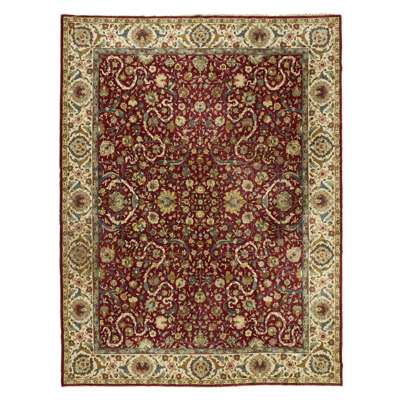 the dark red field with allover palmette and foliate vine pattern, within ivory border