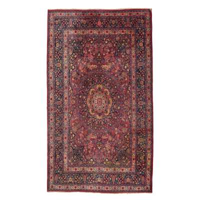 the red field with indigo and light brown medallion, indigo spandrels, within indigo border, signature to border