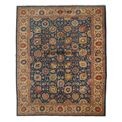 the indigo field with allover Shah Abbas palmette and vine pattern, within cream border