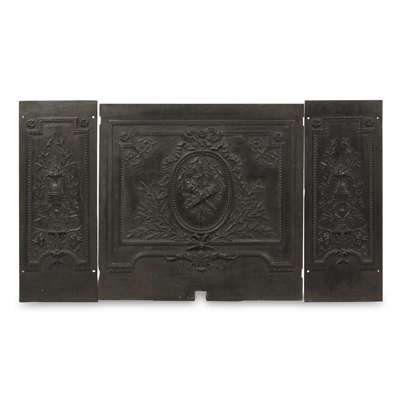 the fireback of rectangular form with a trophy of a flaming torch and quiver of arrows suspended from a bow, within a beaded border and corner rosettes, the two side panels en suite (3)