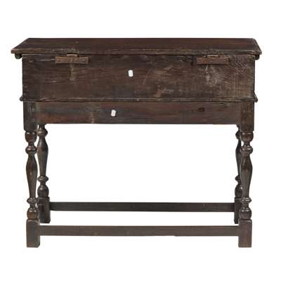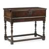 the hinged top with a moulded edge opening to a void interior, on an integrated stand with turned baluster supports joined by peripheral stretchers