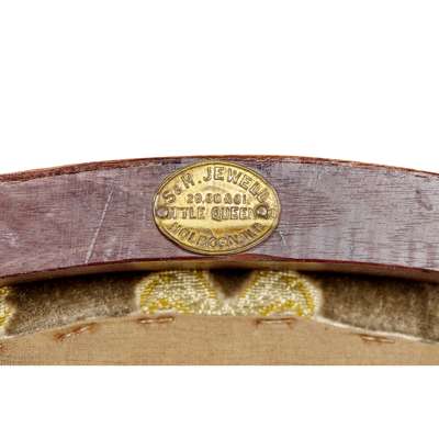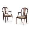 the cartouche shaped and moulded backs with a pierced splat with stiff leaf and acanthus carving, the arms with ball terminals, raised on fluted and tapered legs, one bearing an S & H JEWELL brass label (2)