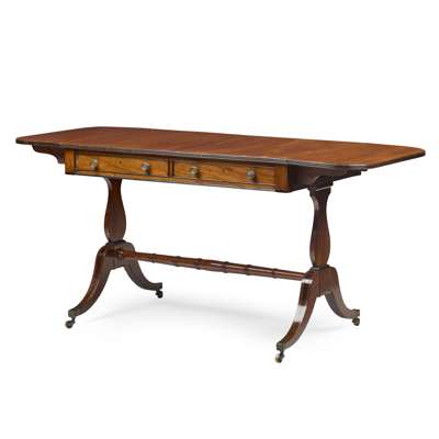 LATE GEORGE III MAHOGANY AND EBONISED FRUITWOOD SOFA TABLE