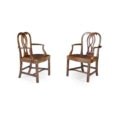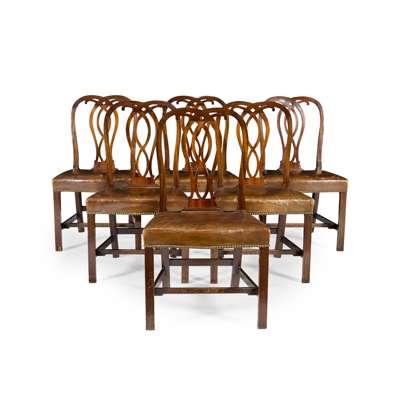 to include ten side chairs and a pair of armchairs, with pierced vasiform splats above stuffover seats covered in brown leather with close nail trim, raised on chamfered square legs joined by stretchers (12)