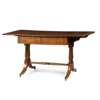 the rounded rectangular top with crossbanding and a reeded edge, above a pair of short frieze drawers with dummy drawers opposing, raised on twin column supports joined by a turned stretcher and ending on sabre legs with brass caps and castors