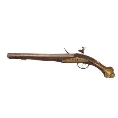 probably Dutch, the 12 inch engraved barrel struck with proof marks (rubbed), the full walnut stock carved in relief with foliate design, the action with some rubbed engraving below the pan, with reeded frizzen, the other wide with pierced brass mount, brass trigger guard and ramrod caps, the elongated brass mounted butt with chased boss