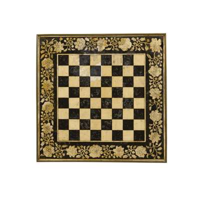 the square brass-banded top with a black and white penwork games board enclosed by floral borders, with a pair of slides to either side, raised on a turned column with outscrolled legs raised on ball feet