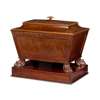 of sarcophagus form, the hinged cover with a lobed knob final, opening to a divided interior, raised on carved paw feet and a plinth base