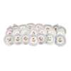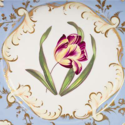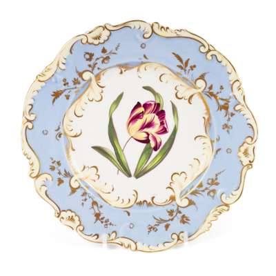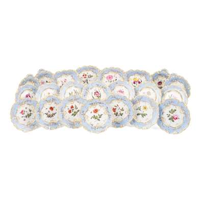 each piece centrally painted with a floral botanical specimen, within a pale blue ground border with gilt foliate details and a moulded scroll rim in cream and gilt; comprising fourteen plates, 23cm diameter; two oval twin-handled dishes, 30 cm wide; four round dishes with one handle, 24cm wide; two square twin handled dishes, 28cm wide; puce printed mark for ‘Chamberlains Worcester and 155 New Bond Street London’ (qty)