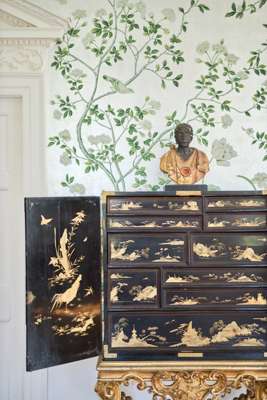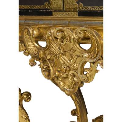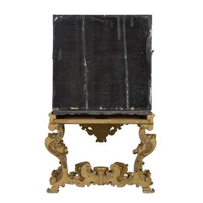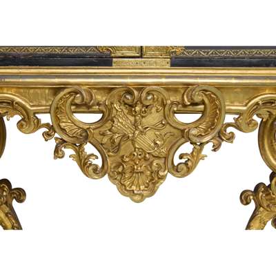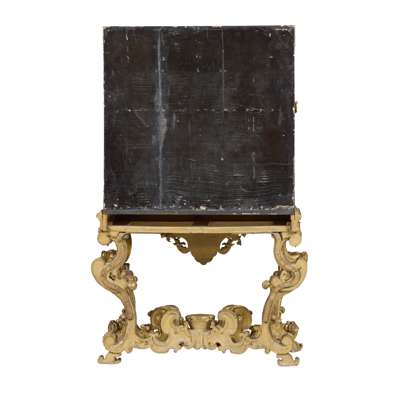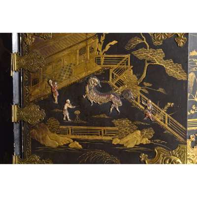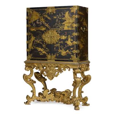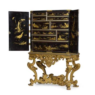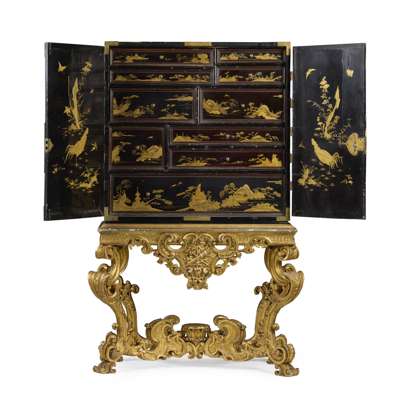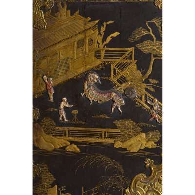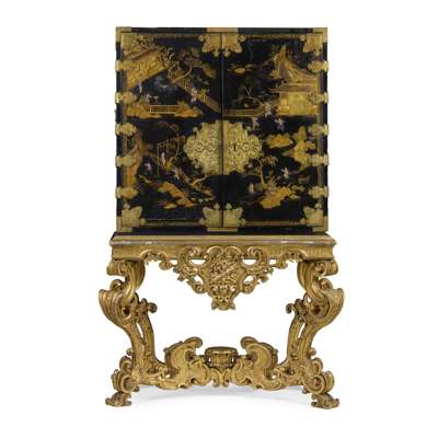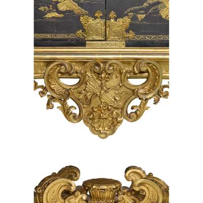 both with pairs of doors depicting matching landscapes with pavilions, temples, bridges, and mountains, mounted with relief-carved hardstones of boys at play, the doors with gilt metal strap mounts and large escutcheons, opening to interiors fitted with arrangements of long and short drawers depicting riverside villages and landscapes; on carved giltwood stands with armorial cartouches to the aprons, raised on C scroll legs joined by an X stretcher (2)
