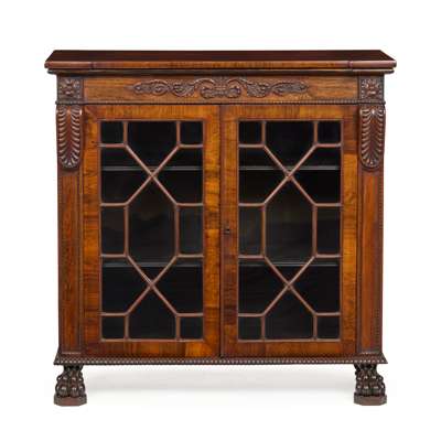 the top of inverted breakfront outline above a foliate scroll carved frieze with flower head carved corner blocks, over a pair of astragal glazed doors enclosing adjustable shelves flanked by stiff leaf capped pilasters, raised on carved paw feet