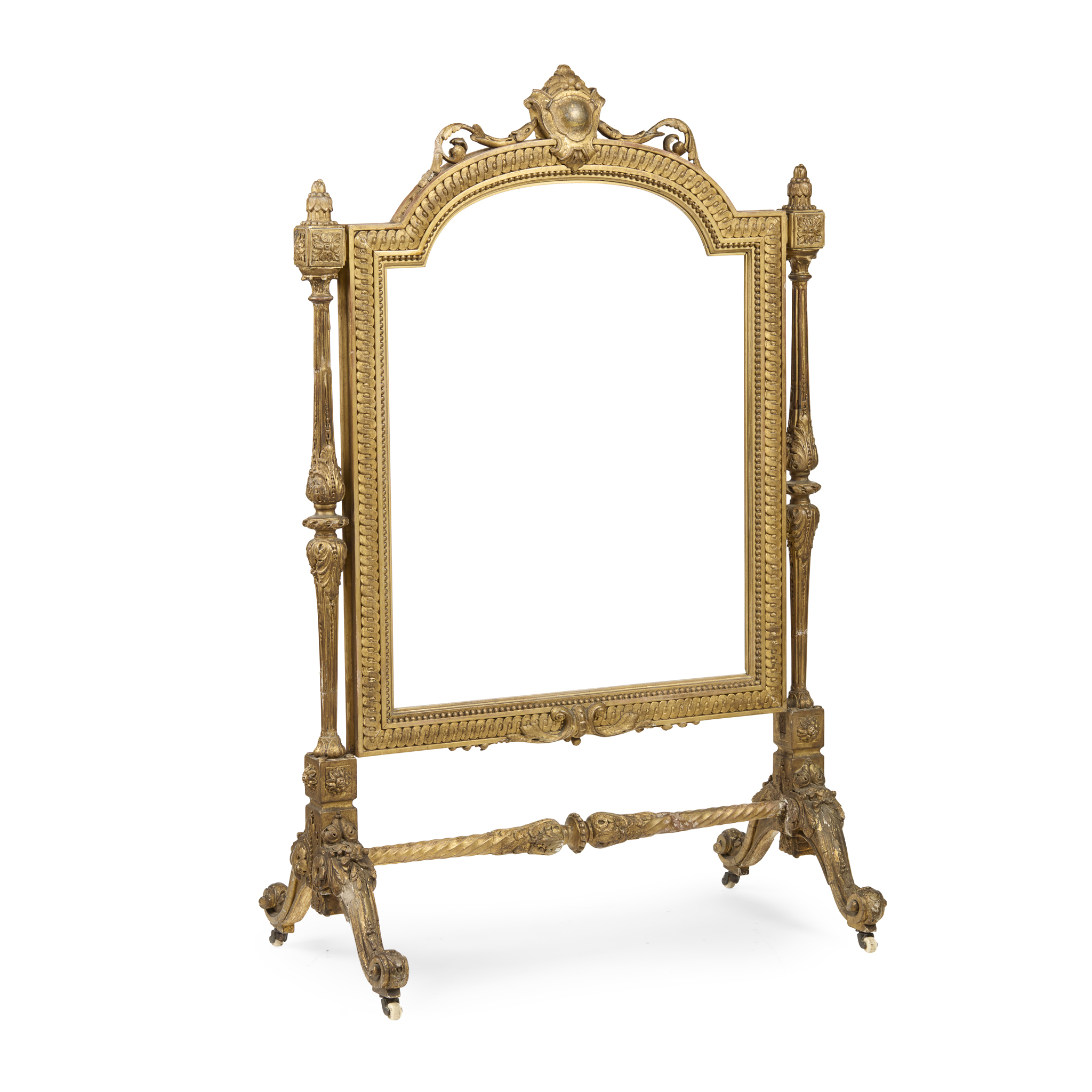 the arched glazed panel in a guilloche and bead moulded frame surmounted by a cartouche, on foliate carved supports joined by a stretcher and scrolled legs ending in scrolled toes and porcelain castors