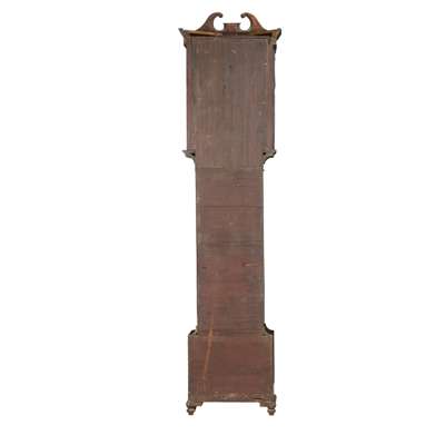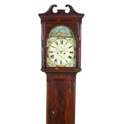 the 14 inch cream enamel breakarch dial with Roman numerals, subsidiary seconds and date dials, signed ‘Jas Murdoch, Newton Ayr’ to the centre, painted floral spandrels, the arch with a scene of a sea view of Ailsa Craig, the centre of the arch with a painted pendulum regulated bobbing automaton in the form of a three masted ship, the mahogany case with a broken swan neck pediment over a caddy top, the dial flanked by free turned columns, the rectangular trunk door flanked by fluted Doric quarter columns, on a square plinth base set on turned feet, twin train weight driven movement striking to a bell