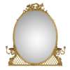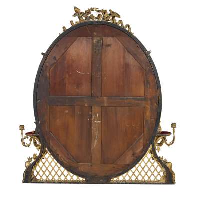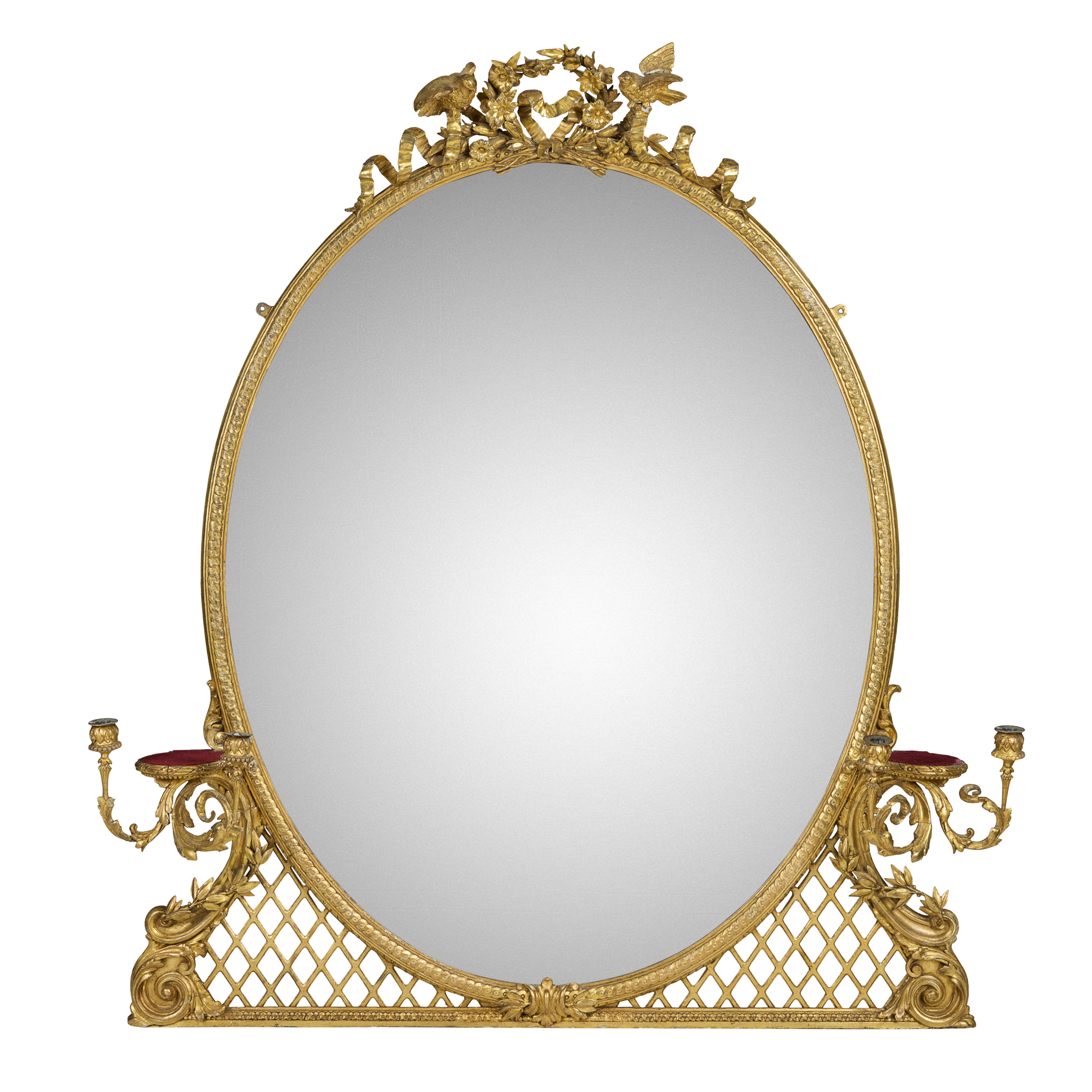 the oval mirror plate in a guilloche moulded frame on trellis bracket supports and issuing four foliate scrolling candle arms with platforms, surmounted by a pair of birds, ribbons, and flower cresting