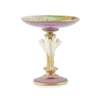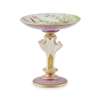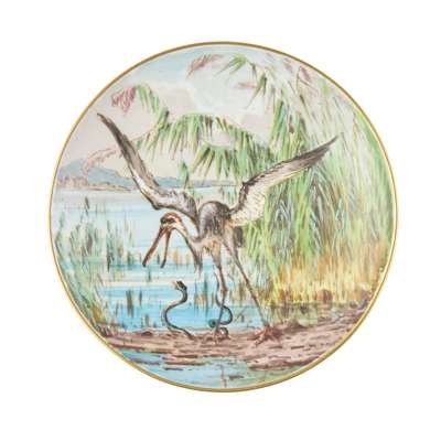 the stem modelled in bisque as three standing storks, their wings supporting a beaded knop and a circular top with purple glaze on the underside, the top painted with a waterside scene of a stork attacking a snake, within a gilt rim; raised on a purple glazed circular foot with stylised scrolling foliate gilt decoration; unmarked
