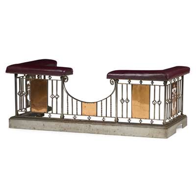 with two L shaped seat pads in oxblood leather above open knop twisted supports set with copper panels, the side panels pierced with thistle cut-outs, on a moulded base