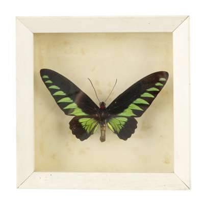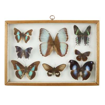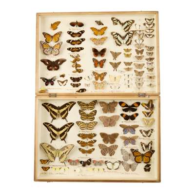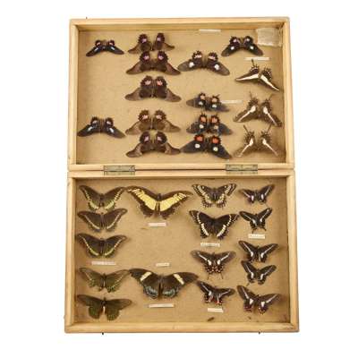 to include two double-sided wooden collector's boxes with butterfly specimens, one box containing African specimens of the Papilionidae family, the other with a paper label from ‘Watkins & Doncaster, Naturalists, 36 Strand, London’ containing specimens with handwritten paper labels dated 1928; together with a double glazed teak case of eight specimens of iridescent butterfly and a small white glazed box framed specimen of a male Trogonoptera brookiana, or Rajah Brooke's birdwing, from Malaysia (4)