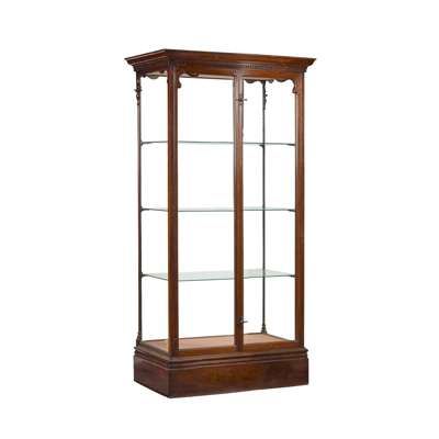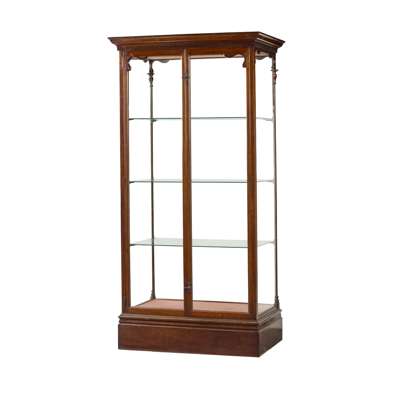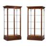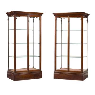 with dentil moulded cornices and three adjustable glass shelves enclosed by a pair of glazed doors, freestanding and glazed on all sides, on plinth bases, one with a label L. BRADBURY, 45 SHUDEHILL, MANCHESTER (2)
