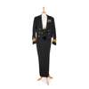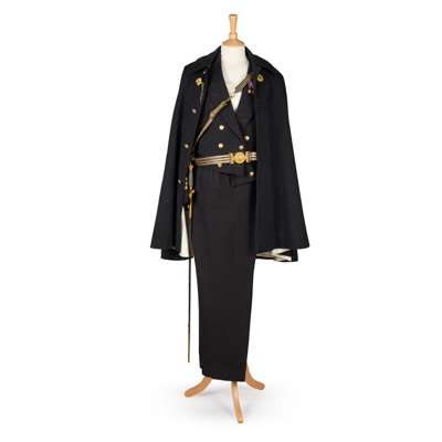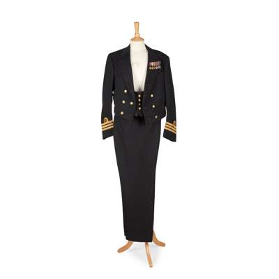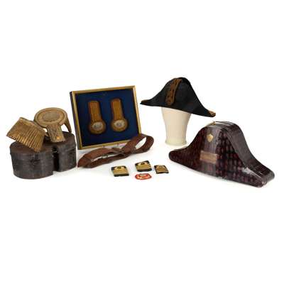 comprising a jacket with three gold bands to the sleeve, a row of miniature WWI & George VI medals, trousers and waistcoat, triple banded gilt sword belt and a Victorian officers dress sword, by Hamburger Roger & Co., 30 Kings Street, London; together with an early 20th century khaki Scottish Egypt campaign uniform, comprising a kilt and khaki canvas jacket with Egypt badges; together with a toleware boxed pair of Victorian gold thread epaulettes, a toleware boxed naval officers bicorn hat, a framed pair of gilt chain epaulettes, several naval rank badges and leather army belts (qty)