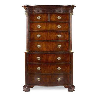 GEORGIAN STYLE MAHOGANY AND BRASS MOUNTED SERPENTINE CHEST ON CHEST