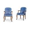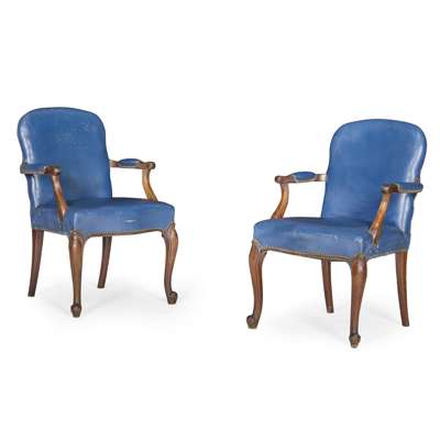 PAIR OF GEORGIAN STYLE BLUE LEATHER UPHOLSTERED OPEN ARMCHAIRS