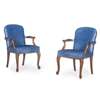 the curved padded backs above wide seats flanked by part-padded scrolled arms, raised on cabriole legs ending in scrolled toes (2)