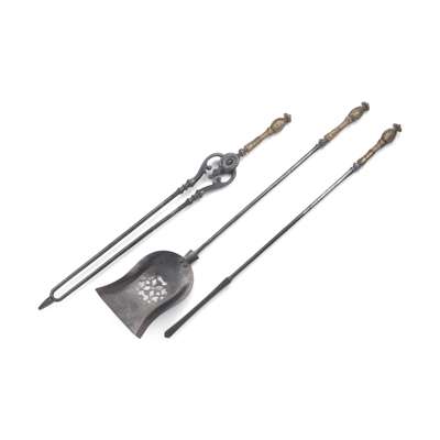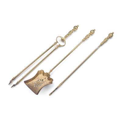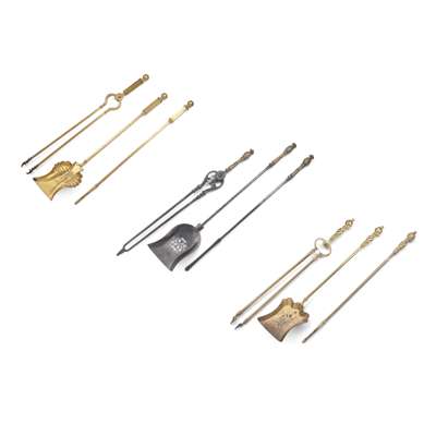 all three sets comprising a shovel, poker and tongs; one set with a turned and fluted handles; the other with square handles with turned knobs; and the third set steel with cast foliate brass handles (9)