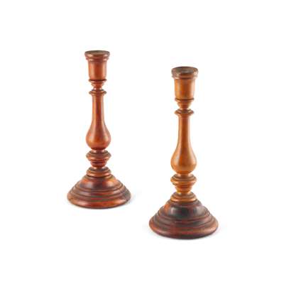 to include a pair of olive wood sticks with open twist stems on a base of four turned spheres, 27cm high; and a pair of baluster stem sticks on stepped circular bases (4)