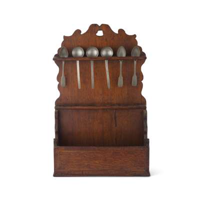 the two tier oak example with scroll crested top incorporating a suspension hole, each spoon rail with six apertures, the box form base with scroll sides and an open compartment, together with six various pewter spoons; the other decorated with chip carved rosettes, the seven apertures containing six horn spoons (2)