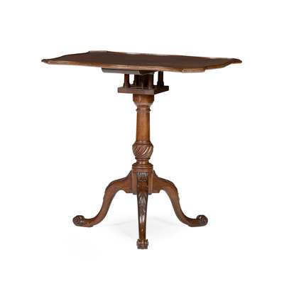 the rectangular serpentine top with cock beaded edge on a turned and gadrooned column, on leaf-carved tripod legs ending in scroll feet
