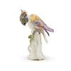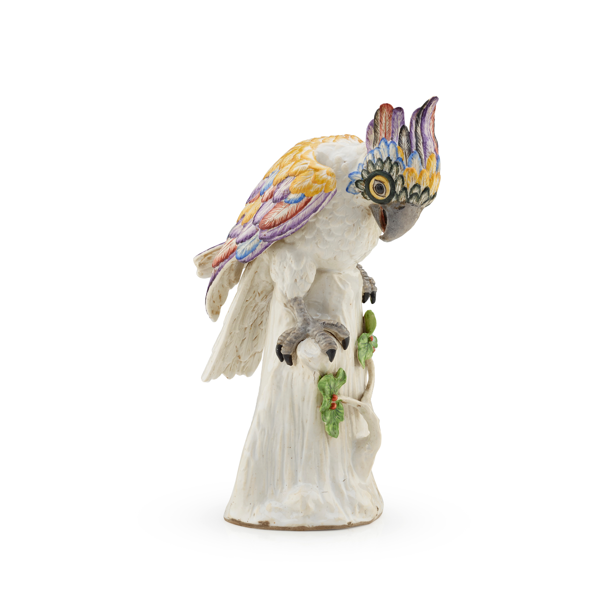 modelled perched on a tree trunk applied with leaves and berries, the plumage enamelled in colours of yellow, red, blue and puce; the interior marked with an incised ‘D’