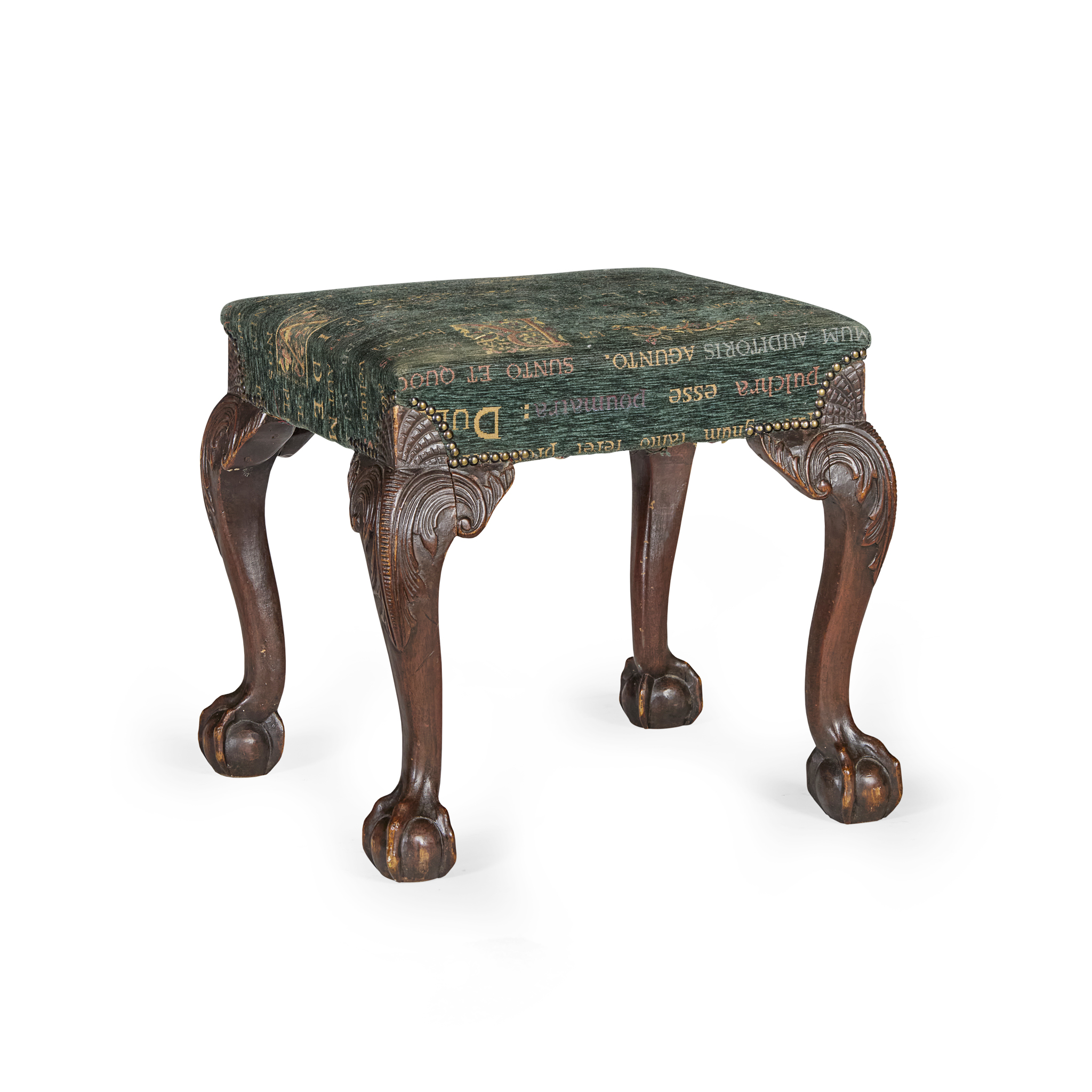the square stuff-over padded seat raised on shell and acanthus carved cabriole legs ending in claw and ball feet