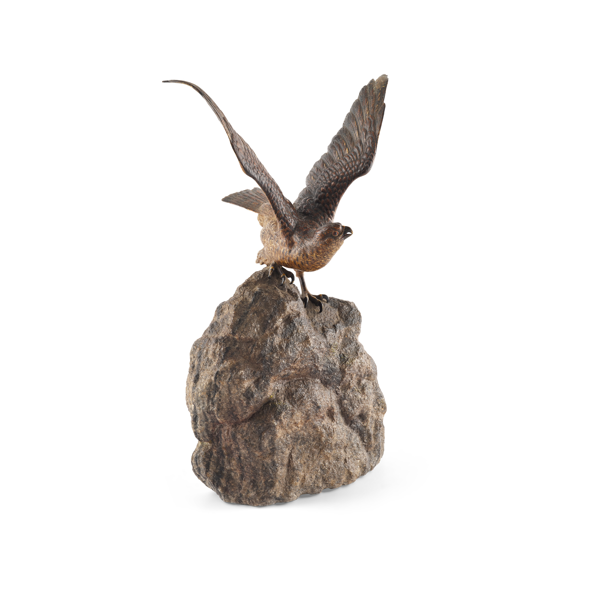 modelled with wings outstretched, naturalistically detailed feathers and colouration, a cast ‘Vase and B’ Bergman foundry seal to the underside, mounted on a rocky outcrop base