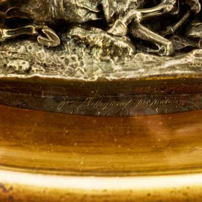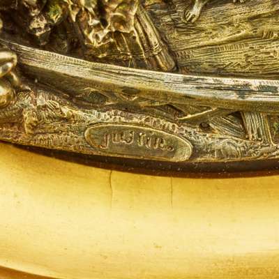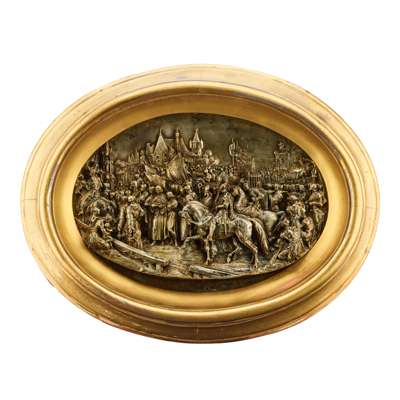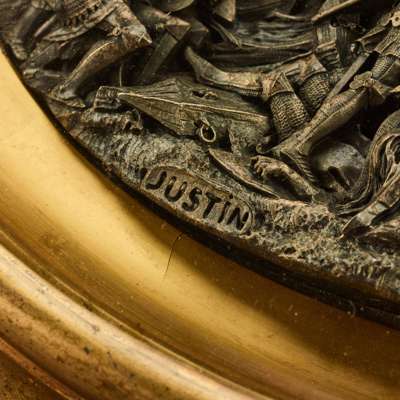 oval, the first depicting “St. Louis with the Crown of Thorns at Sainte Chappelle”; the other ‘St. Louis with his Troops against the Saracens", impressed signature JUSTIN, in giltwood frames (2)