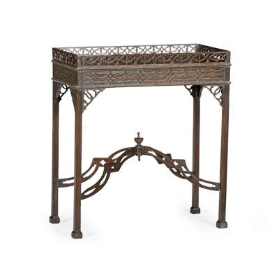 of neat size, the rectangular top with a fretwork gallery over a blind-fret frieze, raised on square straight legs with pierced corner brackets united by arched and pierced X stretchers