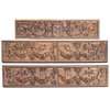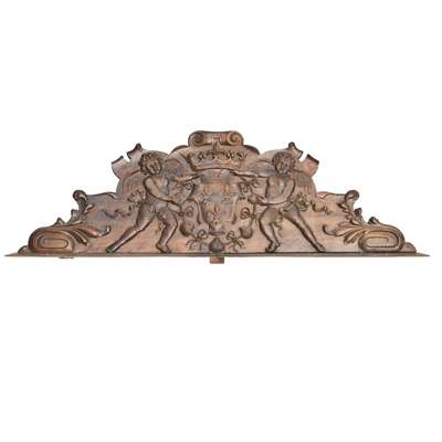 disassembled and reconfigured; the headboard carved with the French Royal coat-of-arms flanked by putti, above a carved frieze with an oval reserve with Venus, flanked and raised on figural carved columns; together with a pair of long panels carved in relief with putti, masks, trophies and garlands; and a smaller example carved with grotesques flanking an armorial (5)