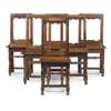 the square framed open backs above plank seats, raised on block and turned legs joined by stretchers (6)