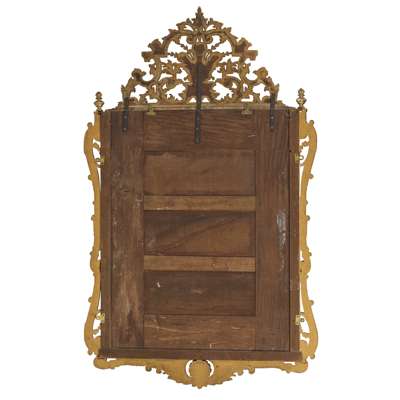 the rectangular mirror plate in a leaf moulded frame flanked by leaf-clasped scrolled columns and surmounted by a large foliate and C scroll cresting