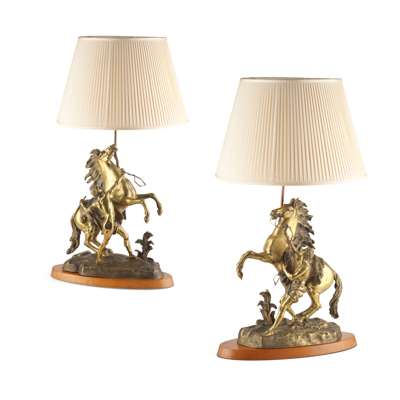 now mounted as lamps, on oval wooden bases with pleated cream shades (2)