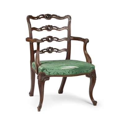 the pierced ladder back carved with palmettes in scalloped and foliate moulding, over a stuff-over seat upholstered in green damask, flanked by serpentine arms with scrolled terminals, raised on foliate carved square cabriole legs ending in scroll feet