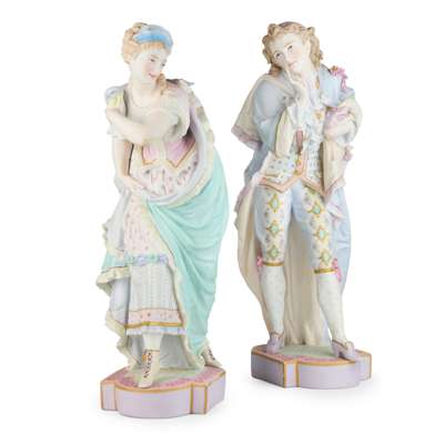 PAIR OF LARGE FRENCH BISQUE PORCELAIN FIGURES OF A GALLANT AND LADY