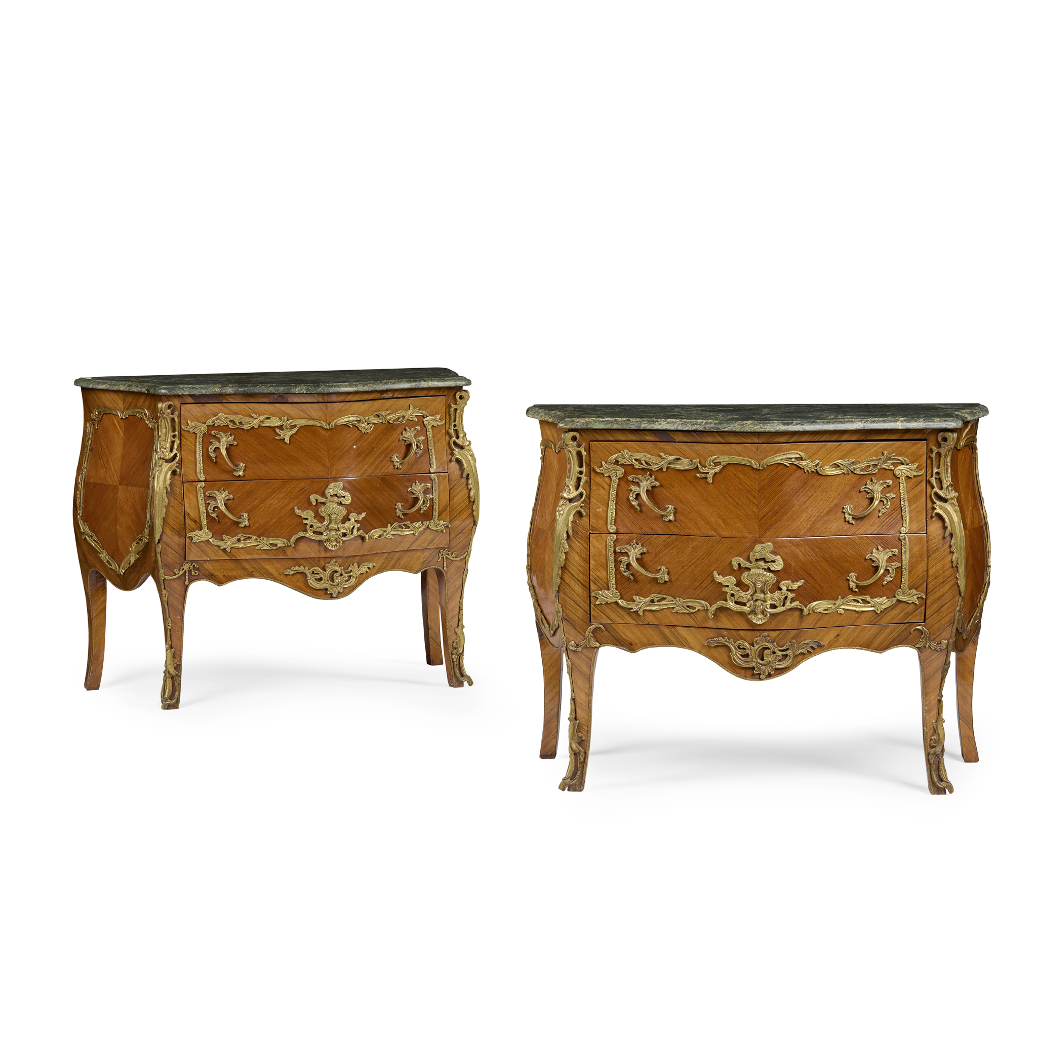 the green serpentine marble tops with a moulded edge, above a pair of long bombe drawers outlined with gilt metal mounts, raised on cabriole legs (2)